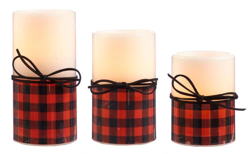 Safely enjoy the ambiance of flickering flames without any actual fire with this For Living Flameless LED Candle Set. It comes with three indoor flameless candles in varying heights, each offering a realistic flickering effect and wick design. The off-white colour is accented with buffalo check fabric at the bottom for a rustic feel. These flameless Christmas candles stay on for five hours, then automatically shut off for 19 to save energy.