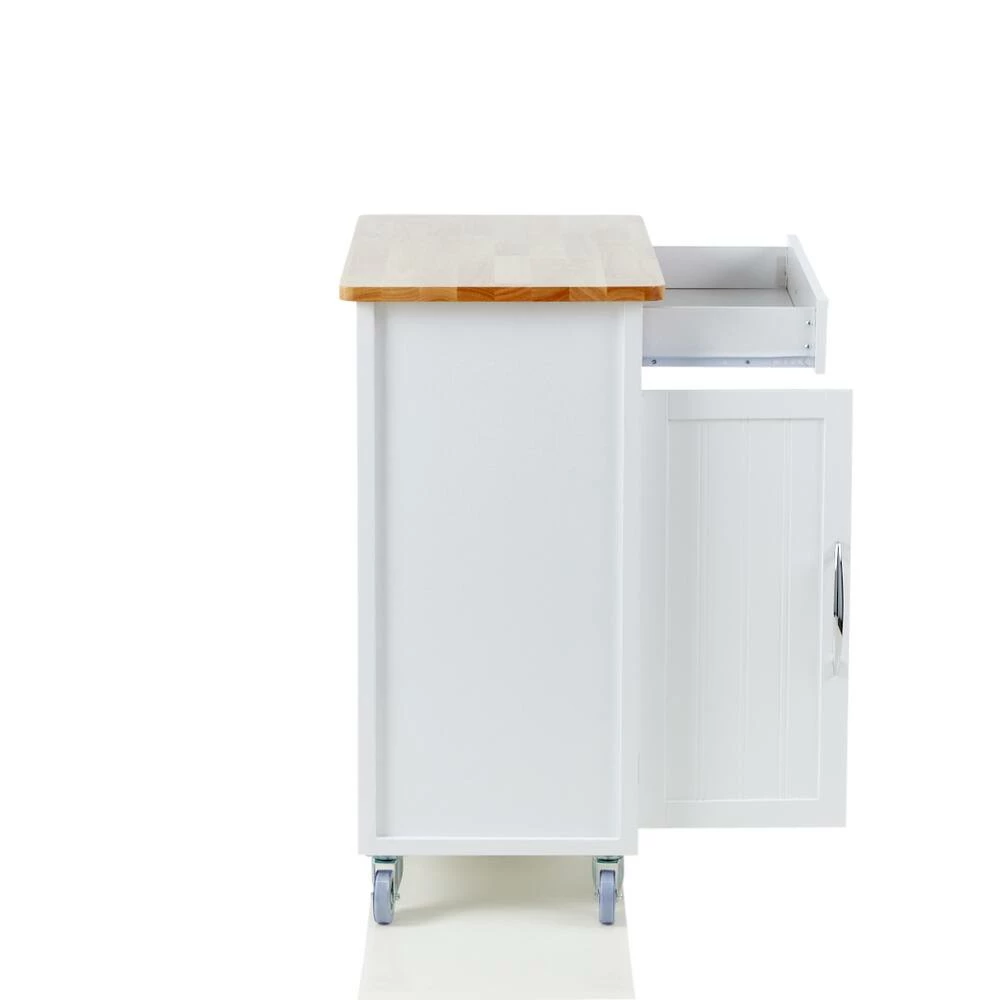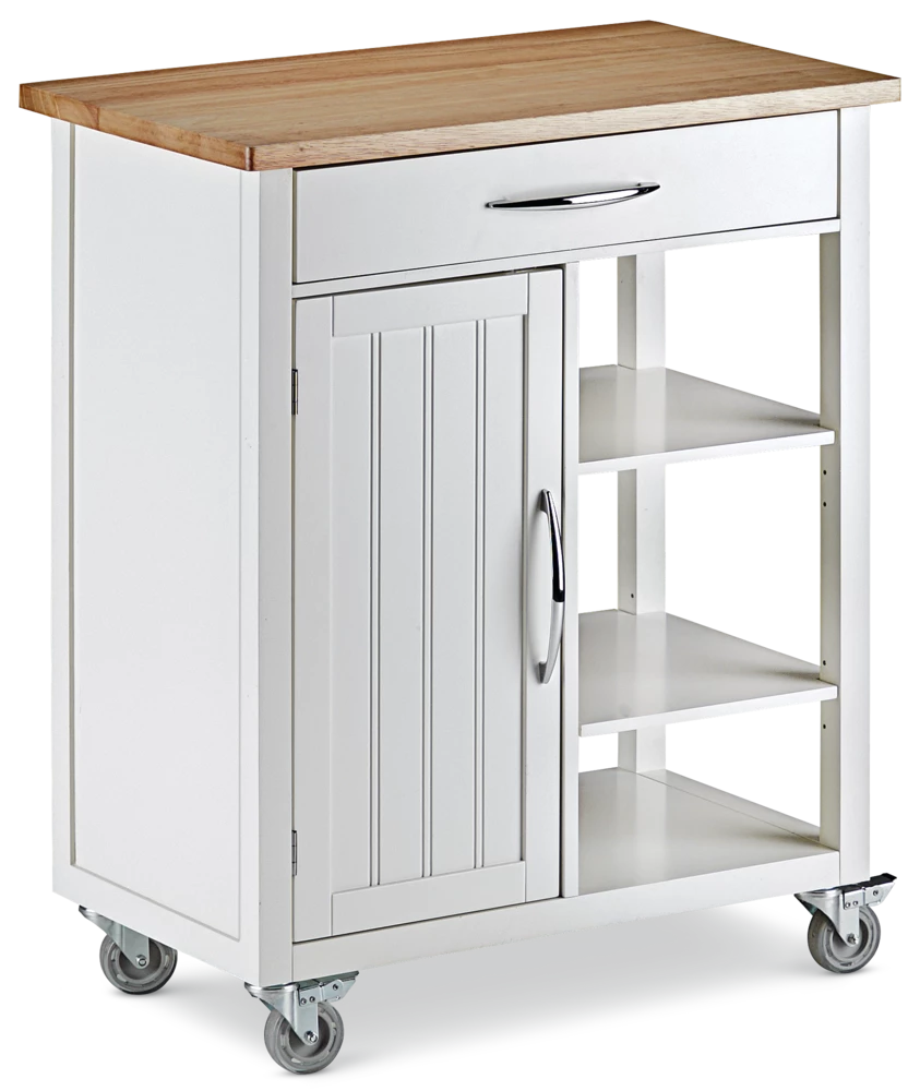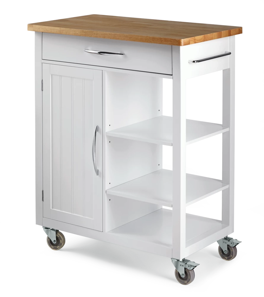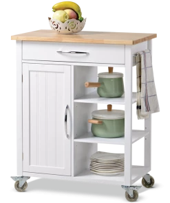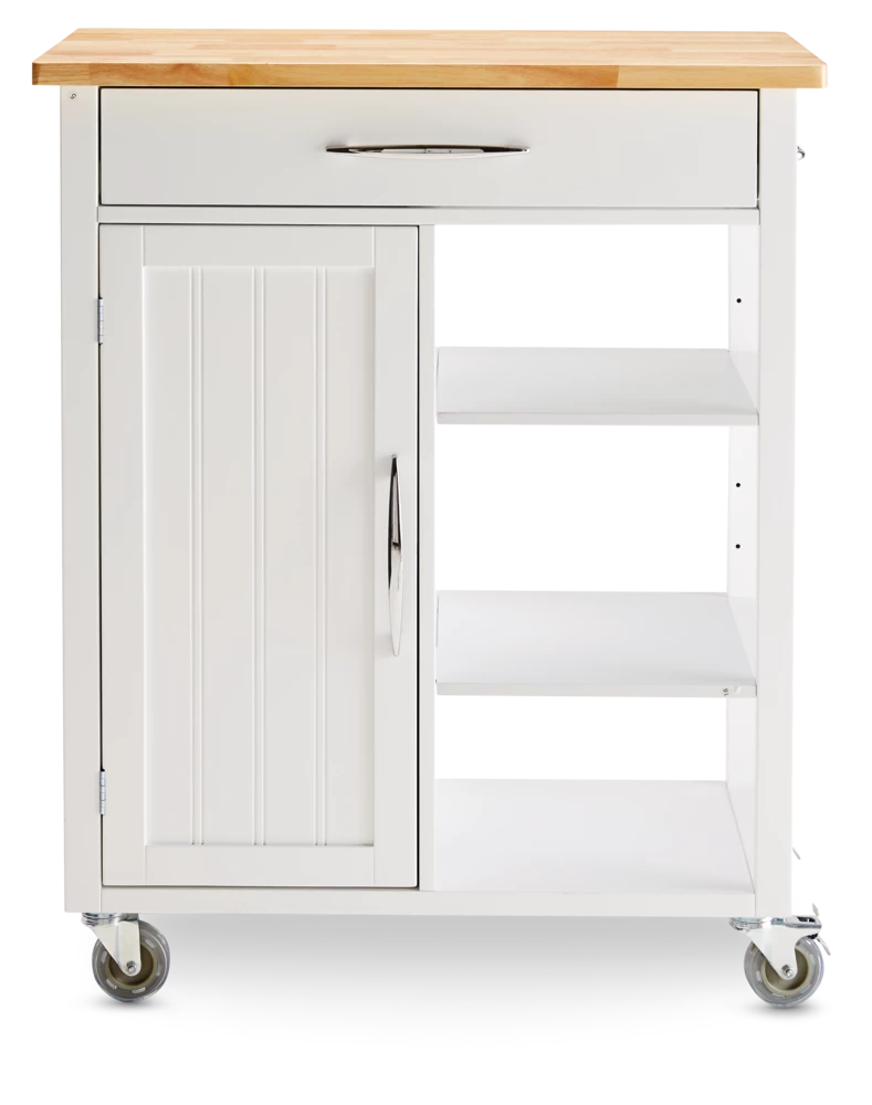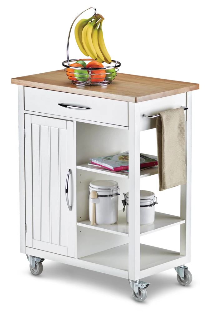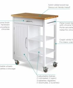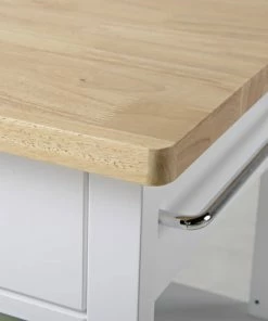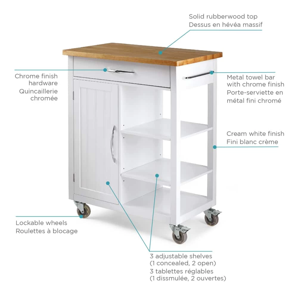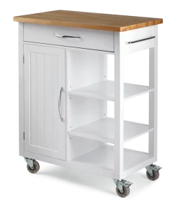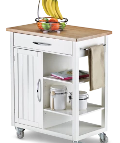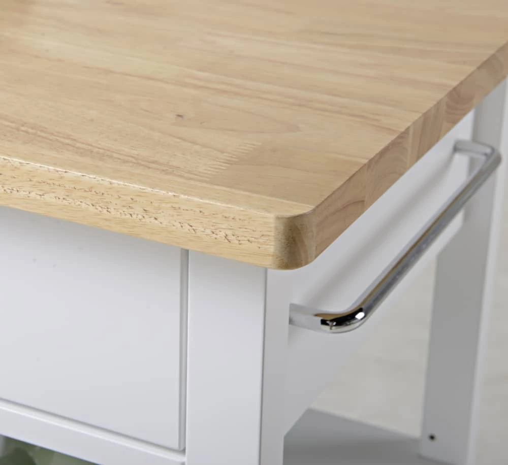 The For Living Wood Top Kitchen Utility Storage Cart/Island provides all-purpose storage and a handy workspace to boost the functionality of any kitchen. This rolling kitchen cart has bottom wheels for mobility, allowing you to position this kitchen cart exactly where you need it for no-fuss set-up. The adjustable shelves allow you to customize the organization to fit what you need. In addition to shelves, this island kitchen cart includes drawers, so you can easily store utensils, pots, pans, bakeware, dishes, glasses, pantry items and more for versatility. This kitchen island cart also features a metal towel rack, so you have all your essential cooking tools and accessories on a single convenient unit for quick, easy access. This utility kitchen cart features a rubber wood top that serves as an additional countertop or as an extra prep area when you’re cooking. The natural wood look and cream white finish offers a rustic look that effortlessly complements almost any kitchen decor. Versatile and functional, this kitchen island and cart is an effective solution for your contemporary kitchen storage and space issues.