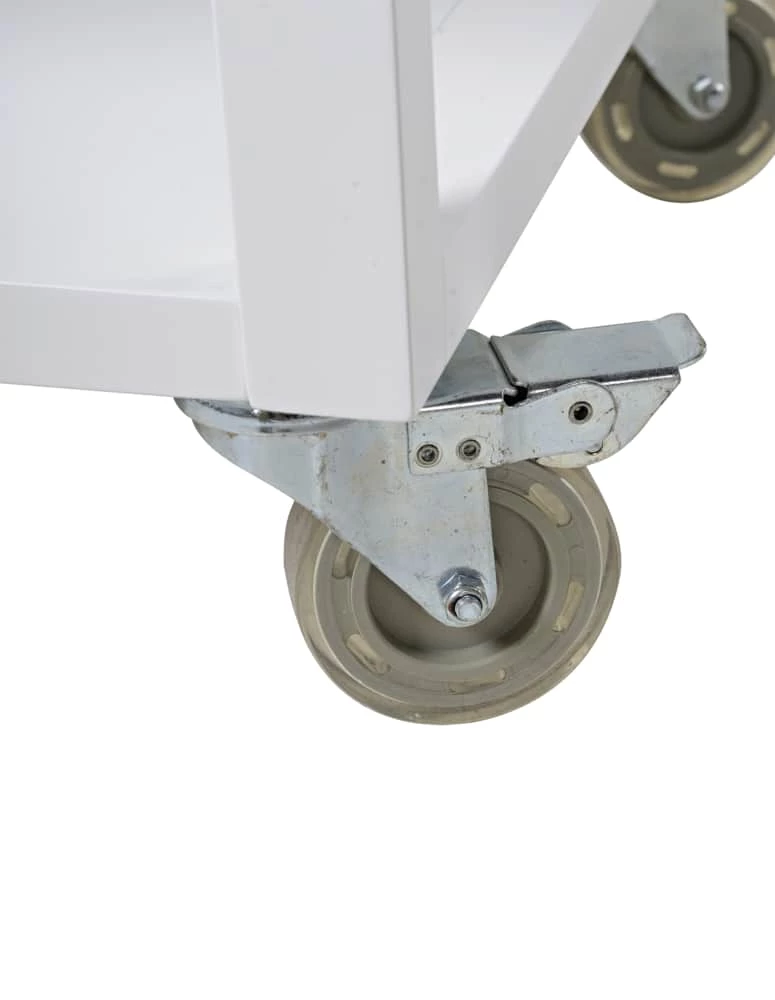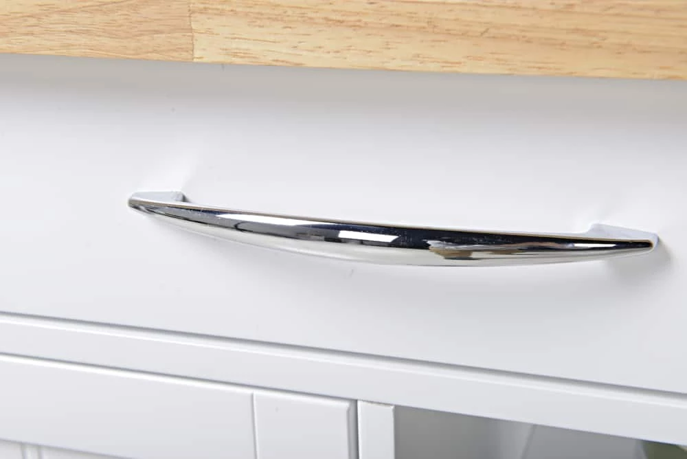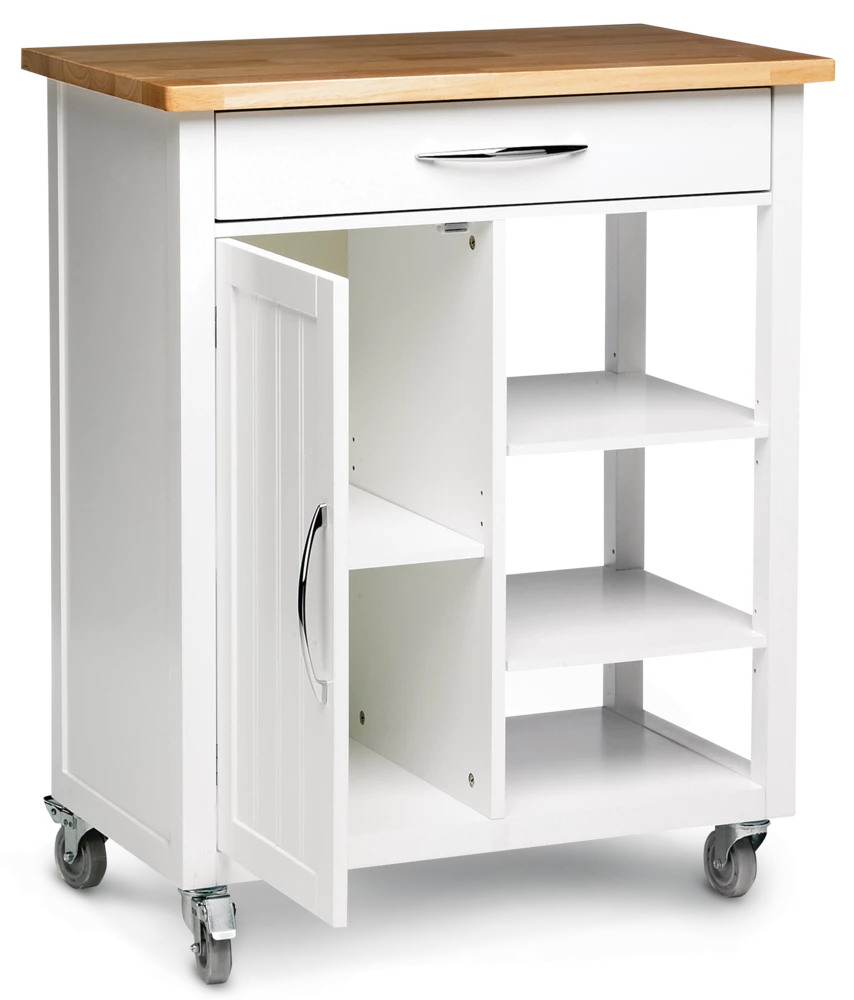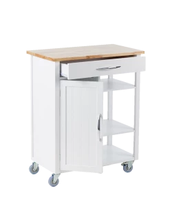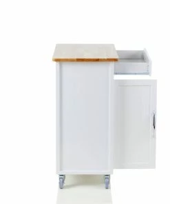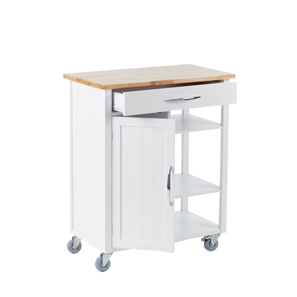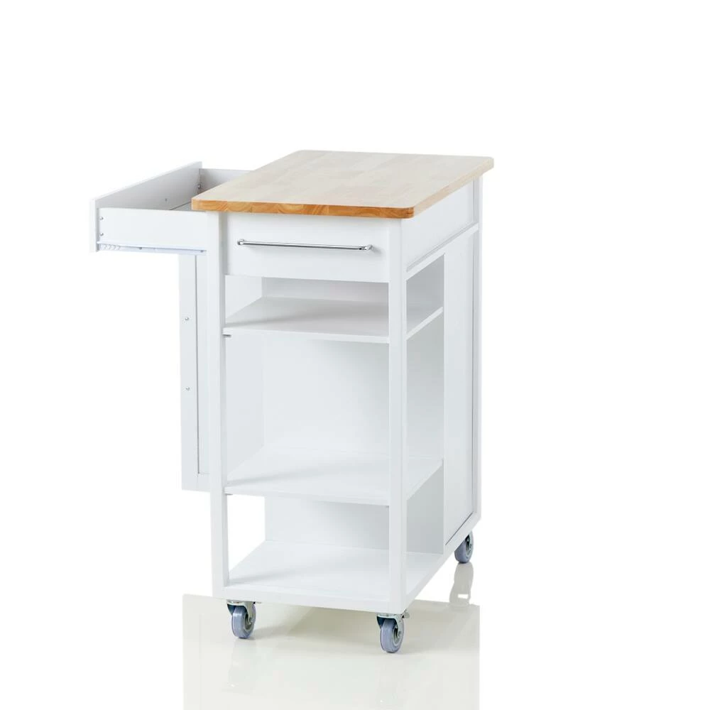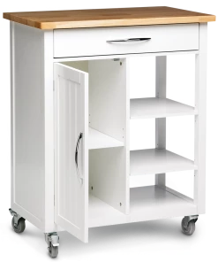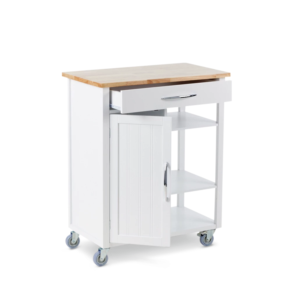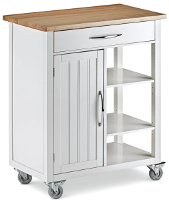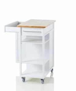 The For Living Wood Top Kitchen Utility Storage Cart/Island provides all-purpose storage and a handy workspace to boost the functionality of any kitchen. This rolling kitchen cart has bottom wheels for mobility, allowing you to position this kitchen cart exactly where you need it for no-fuss set-up. The adjustable shelves allow you to customize the organization to fit what you need. In addition to shelves, this island kitchen cart includes drawers, so you can easily store utensils, pots, pans, bakeware, dishes, glasses, pantry items and more for versatility. This kitchen island cart also features a metal towel rack, so you have all your essential cooking tools and accessories on a single convenient unit for quick, easy access. This utility kitchen cart features a rubber wood top that serves as an additional countertop or as an extra prep area when you’re cooking. The natural wood look and cream white finish offers a rustic look that effortlessly complements almost any kitchen decor. Versatile and functional, this kitchen island and cart is an effective solution for your contemporary kitchen storage and space issues.