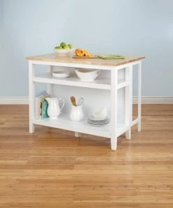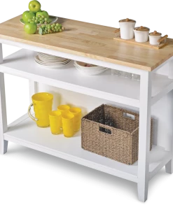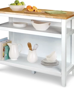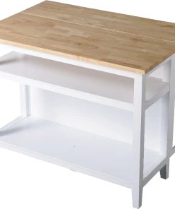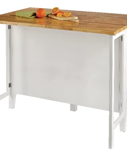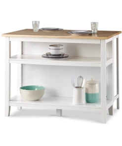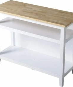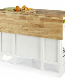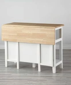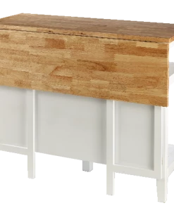 You can easily add storage and style to your kitchen area with this For Living Wood Top Open Shelf Kitchen Island with Folding Leaf. It features a rubber wood top with a striking wood grain that easily coordinates with traditional, contemporary or even modern farmhouse décor. The body of the island table is white, which offers a look that coordinates with virtually any surrounding décor as well. Lower storage shelves provide plenty of space for kitchen appliances, utensils, canisters, dishes and much more. The top of the island counter has a foldable leaf, which allows you to expand the size for added work space while preparing meals, or even for seating if needed. You will find this small kitchen island is compact enough to fit in more modest kitchens, while still offering ample storage to keep your items close at hand. This island is also made from durable materials for a solid build that will hold up over time, so you can enjoy years of practical function and unbeatable style.